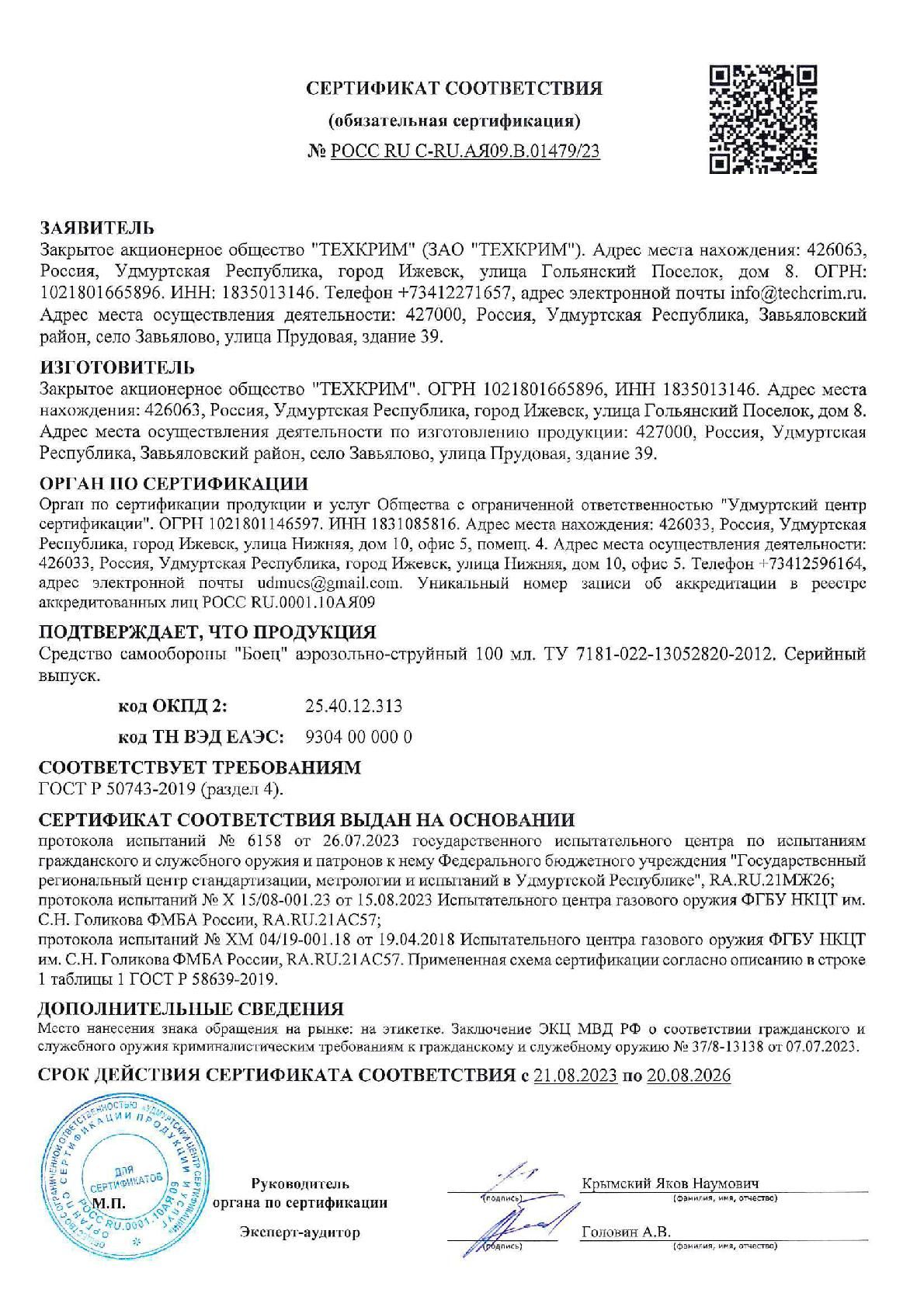 - Тип продукта: газовый баллончик для самообороны «Боец» аэрозольно-струйный.