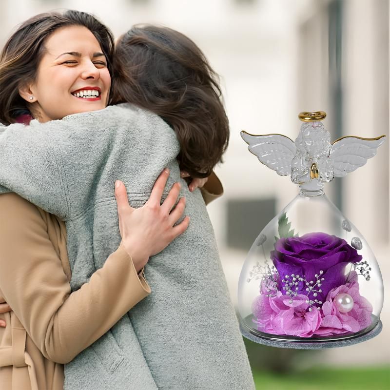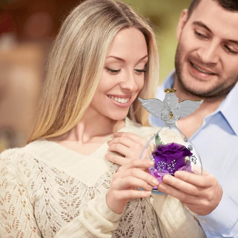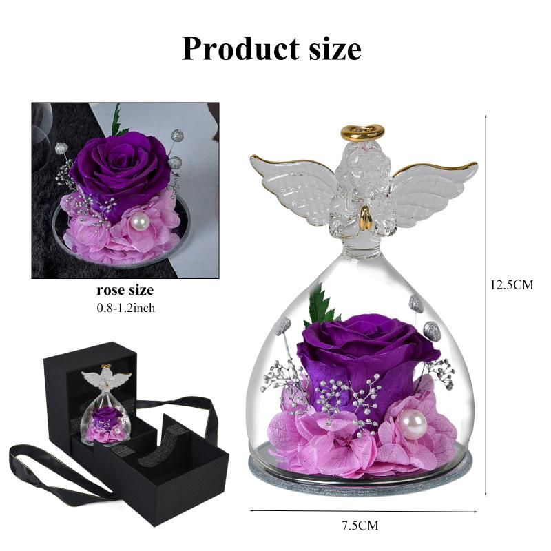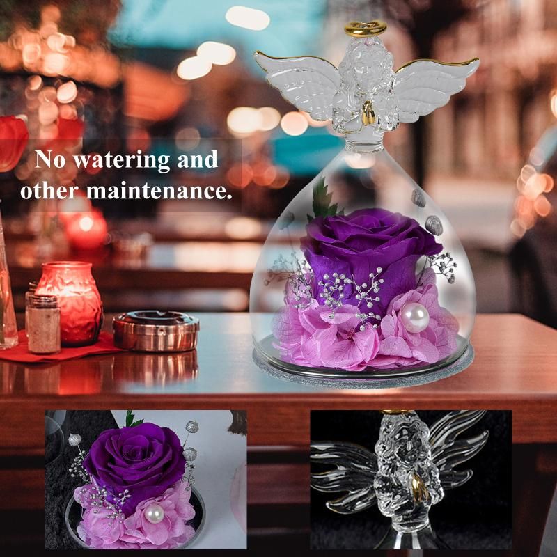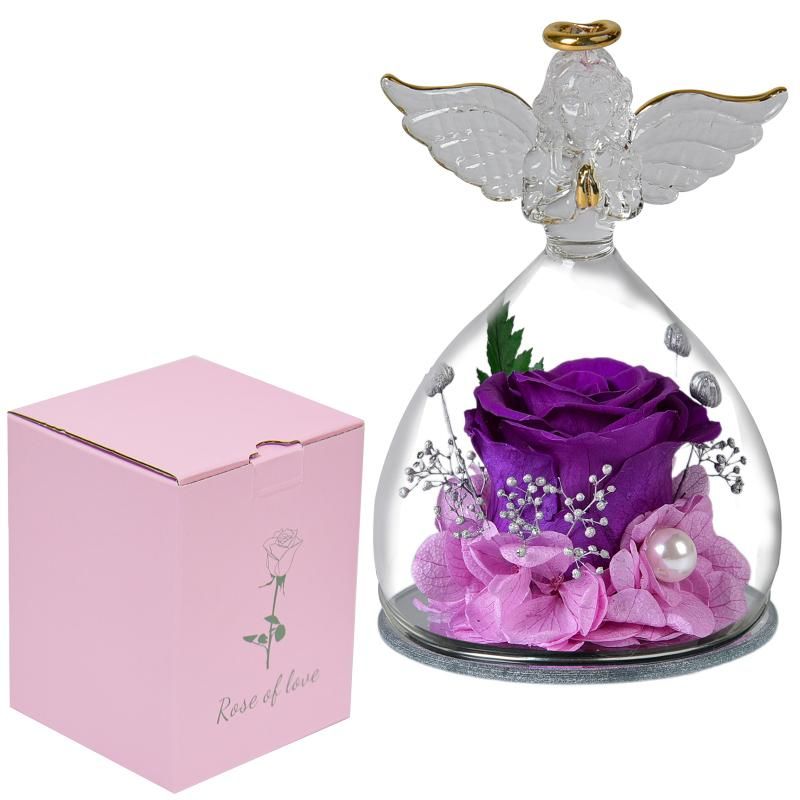 - Романтическая и трогательная статуя ангела с настоящей фиолетовой розой – прекрасный подарок для женщин.