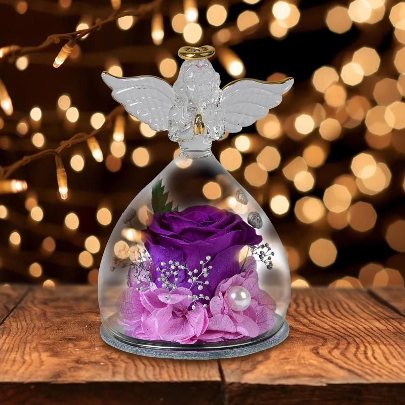 - Нежная и красивая фиолетовая роза, помещённая в стеклянную сферу с ангелом, являются отличным подарком для родных и близких.