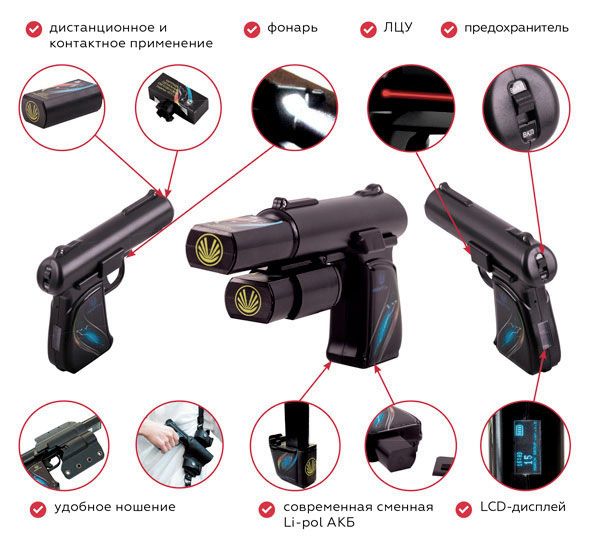 - Эта модель разрабатывалась с учётом пожеланий и рекомендаций сотрудников охранных служб. Поэтому электрошокер-пистолет отличается от других моделей не только оригинальной формой, но и расширенным набором дополнительных опций: