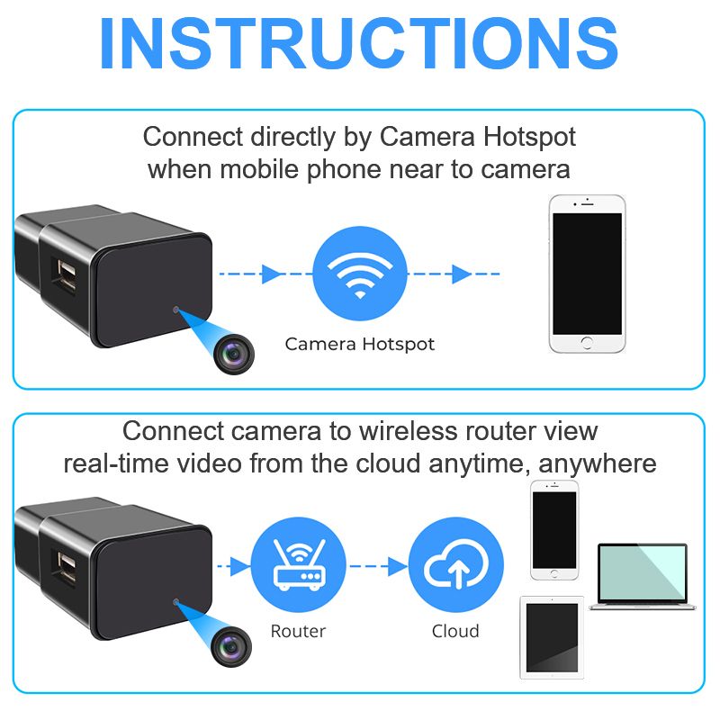 - Эта встроенная видеокамера безопасности также является зарядным устройством USB, просто вставьте MicroSD карту памяти, подключите ее к розетке или блоку питания, или usb-порту, и она будет записывать автоматически. Запись видео в формате full HD 1080p во время зарядки устройства, для наблюдения за детьми дома, сотрудниками в офисе или нянями.