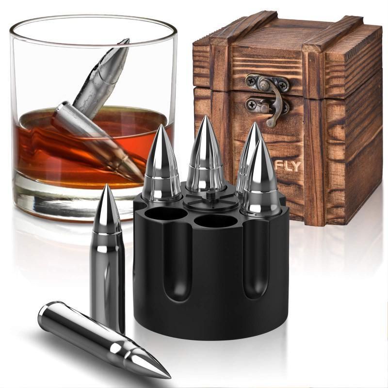 - Подарочный набор камней для виски и других напитков в форме пули, изготовлены из пищевой нержавеющей стали, которая не ржавеет, не имеет запаха и вкуса. Можно мыть и использовать повторно.