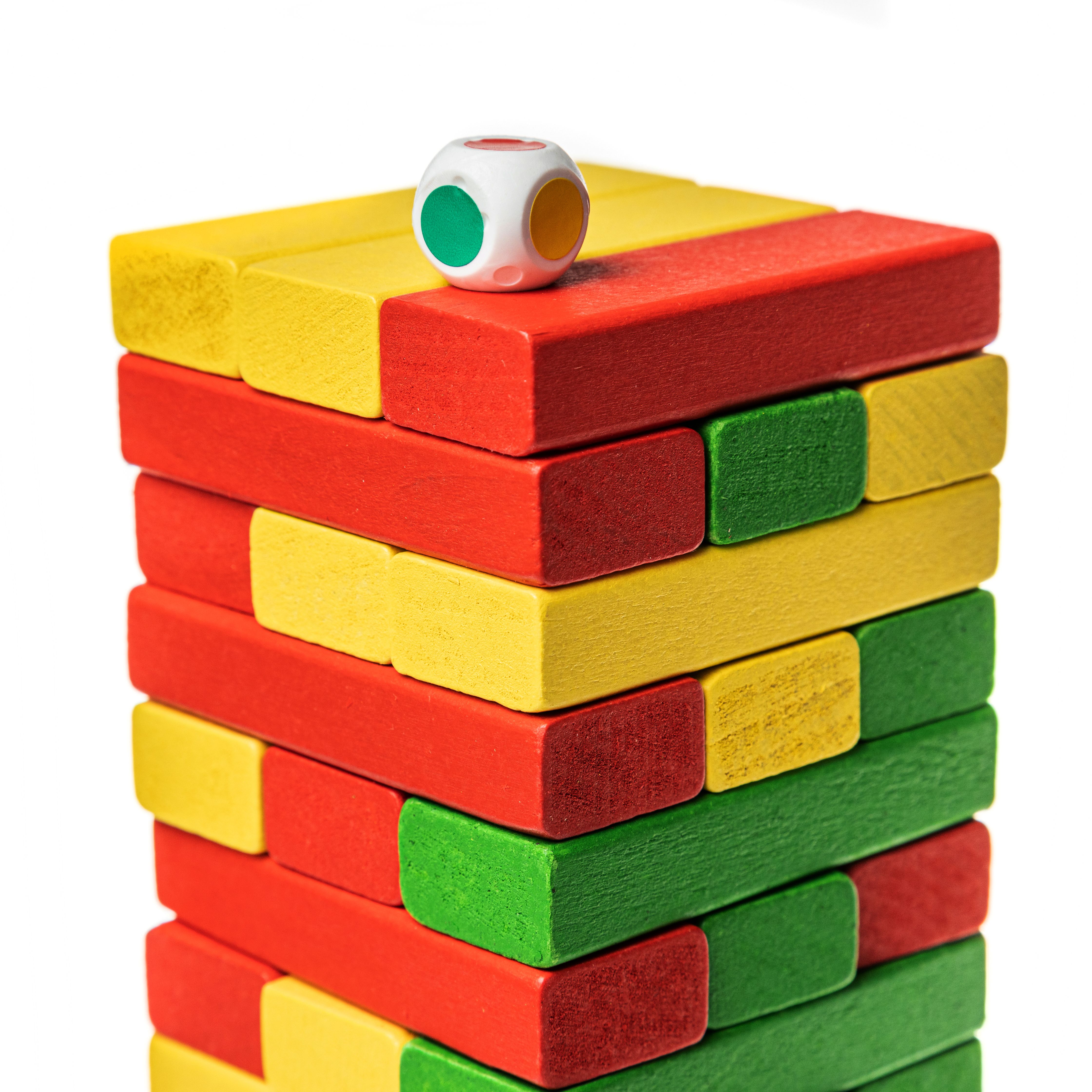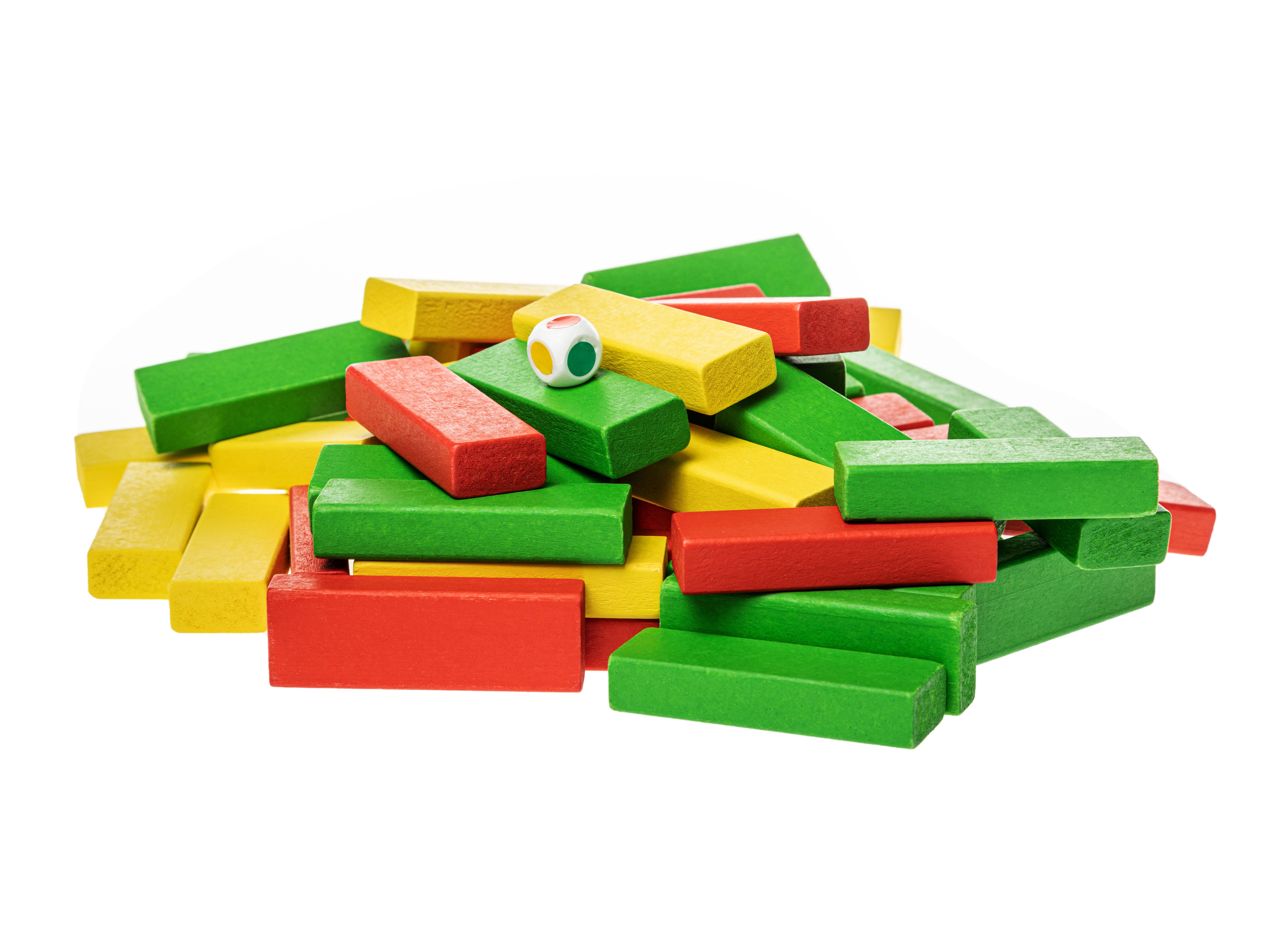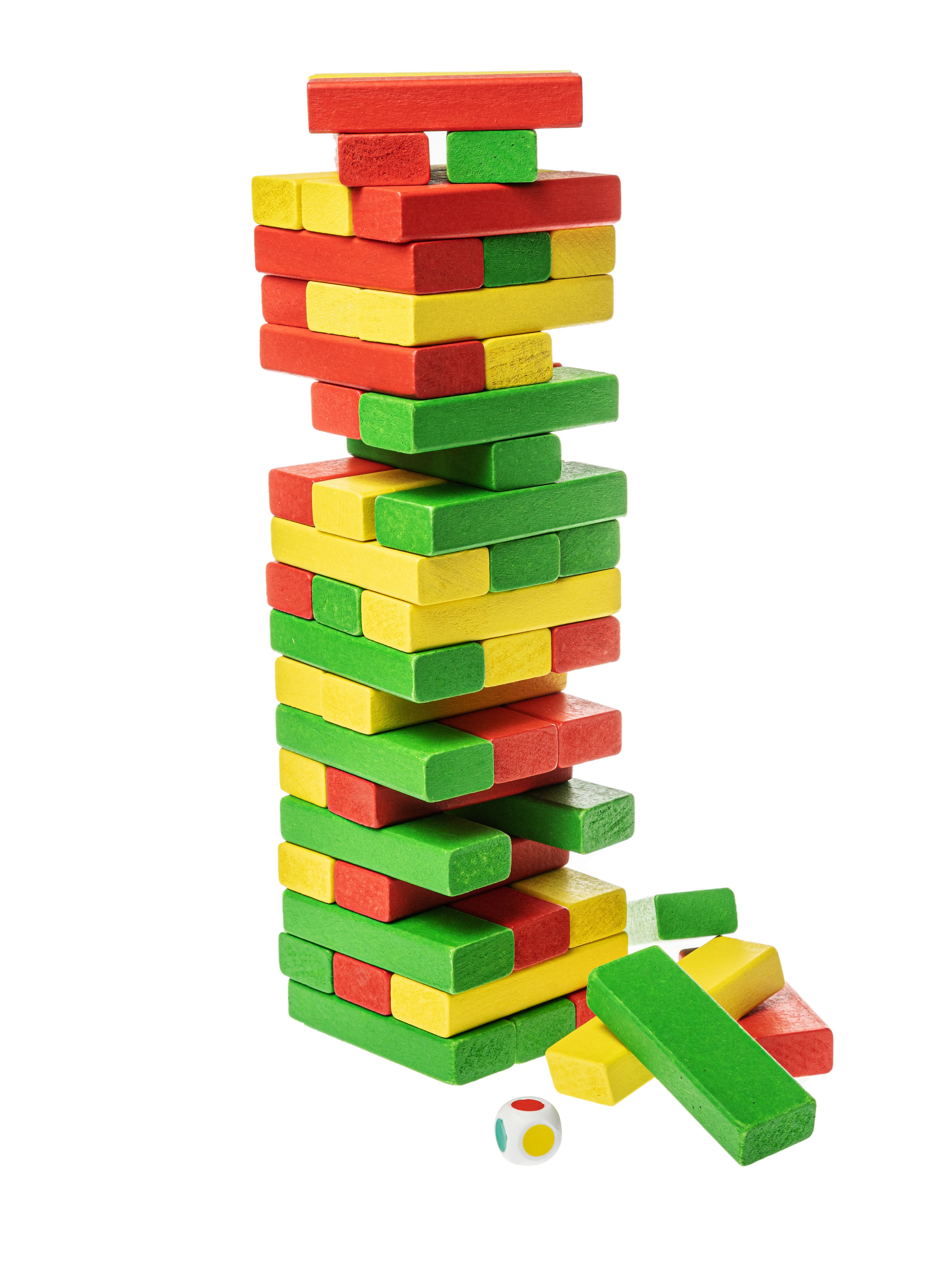 - Ход игры: установив очередность, игроки по очереди бросают кубик, чтобы определить цвет бруска, который он должен переместить. При этом игрок самостоятельно выбирает для атаки любой уровень и вытаскивает одной рукой один из брусков. Этот брусок, оказавшийся в руках игрока, укладывается на новый, верхний этаж сооружения. Везение и ловкость помогут выстроить игрокам башню вдвое больше начальной высоты.