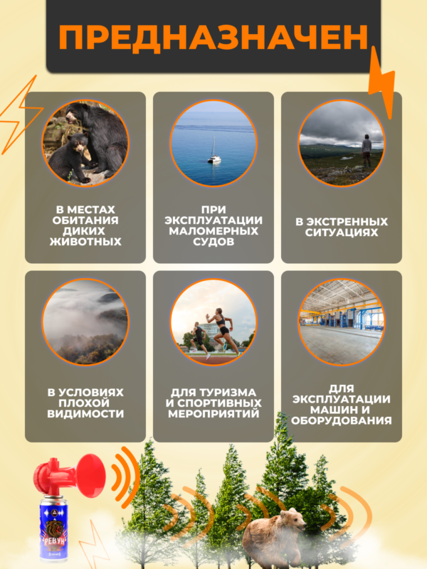 - Предназначено для подачи очень громких и резких звуковых сигналов при эксплуатации и использовании машин и оборудования, маломерных судов, шлюпках и плотах, в условиях плохой видимости и тумана, при спасательных операциях, туристических походах, а также для отпугивания диких животных.